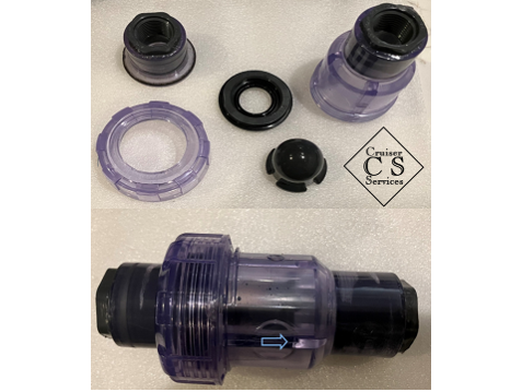 This check valve is unique to Cruiser Services. Modified clear check valve with single union access for servicing / clearing / cleaning.